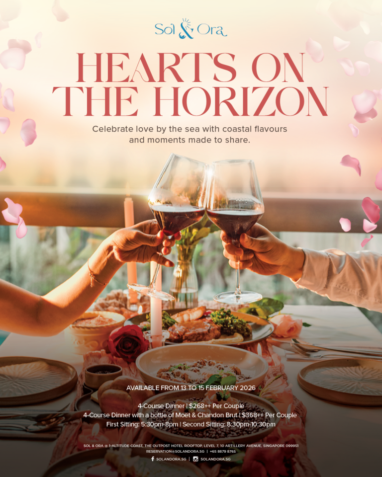 Celebrate love above the waves this Valentine’s Day at Sol & Ora — where Mediterranean warmth meets coastal romance. Treat your special someone to an intimate 4-course dinner at Sentosa’s highest rooftop restaurant, complete with golden-hour skies, sea breeze moments, and flavours made for sharing.